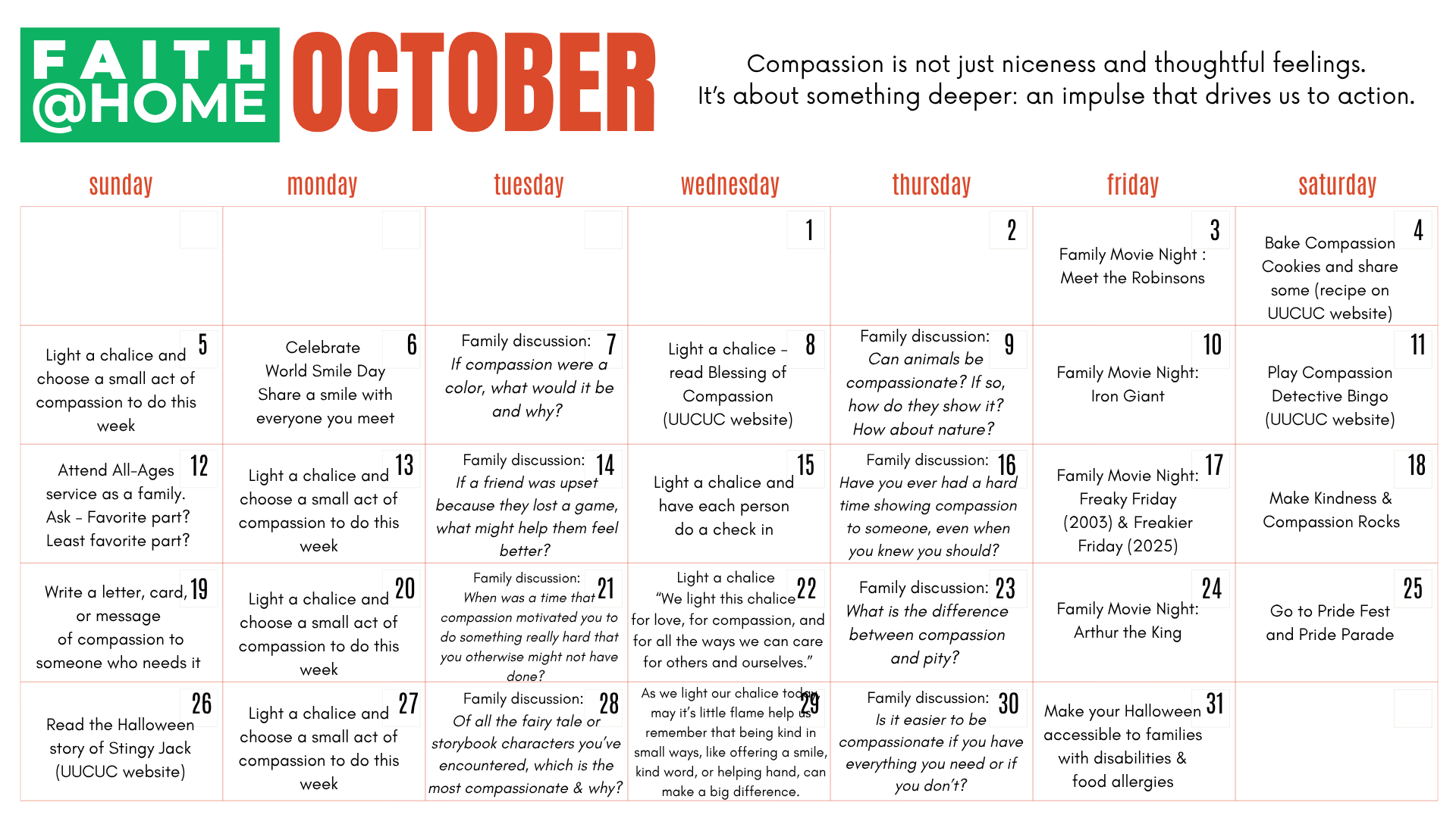 And here’s a secret: As you notice the compassion of others, you’ll be growing your own. Because when we pay attention to the kindness others show, we suddenly start to notice all the opportunities we have to be kind. This treasure hunt is also deeply connected to our Unitarian Universalist faith, which calls us to put love at the center of all we do.