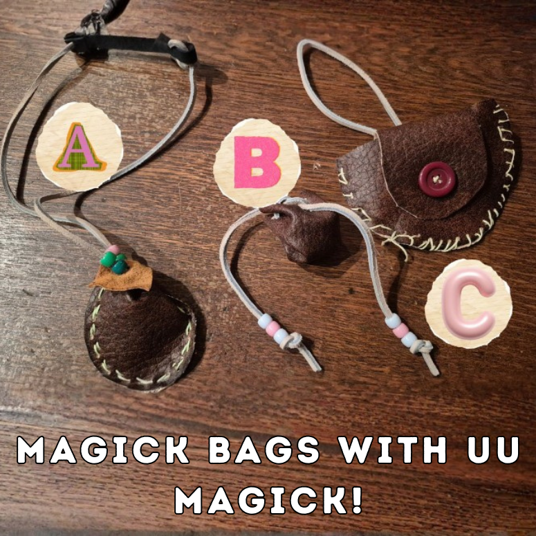 Come out and see us in Fellowship Hall for a magical night of crafting Magick/Ritual Bags with UU Magick. Thursday, March 12th at 6 pm in Fellowship Hall. I have 3 different styles that I am creating homemade kits for accessibility. Please RSVP by Monday, March 9th to let me know which style (A, B or C) you want. I will have a few extras of each created, but I cannot guarantee you will get the one you want if you don’t let me know ahead of time. To select your design please e-mail Aaron