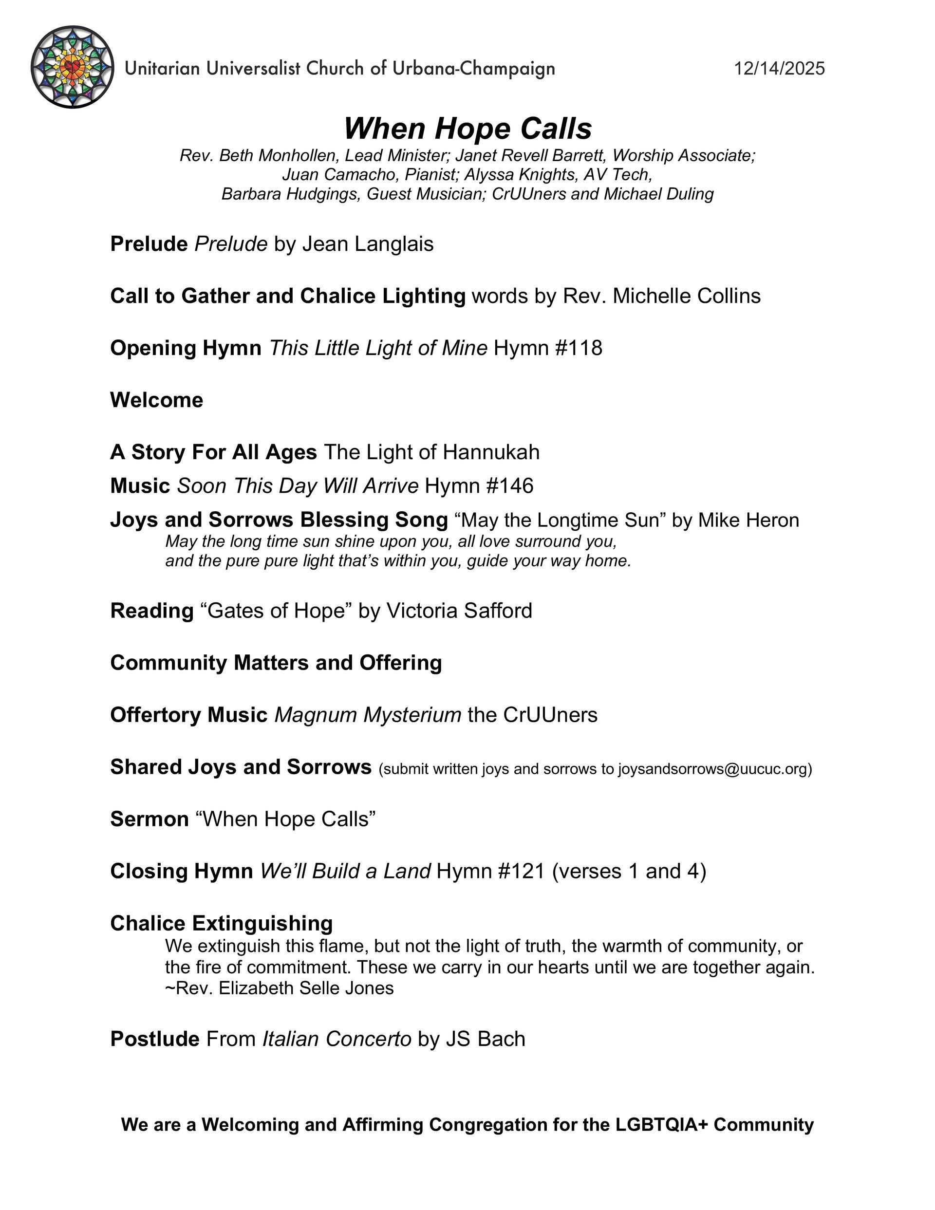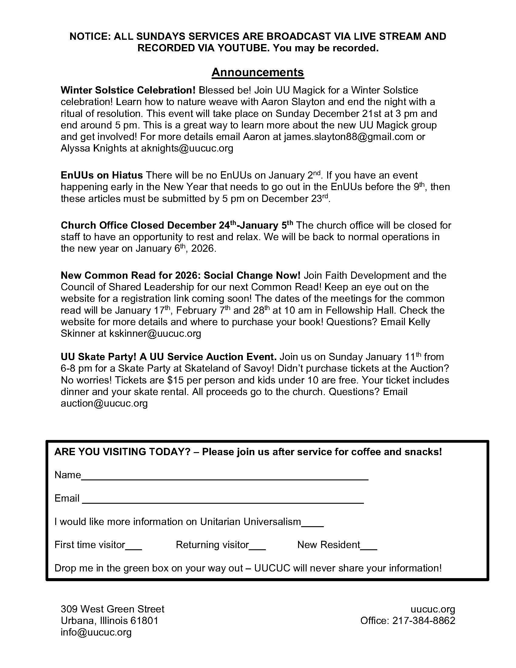 The Unitarian Universalist Church of Urbana-Champaign (UUCUC) is led by Lead Minister,