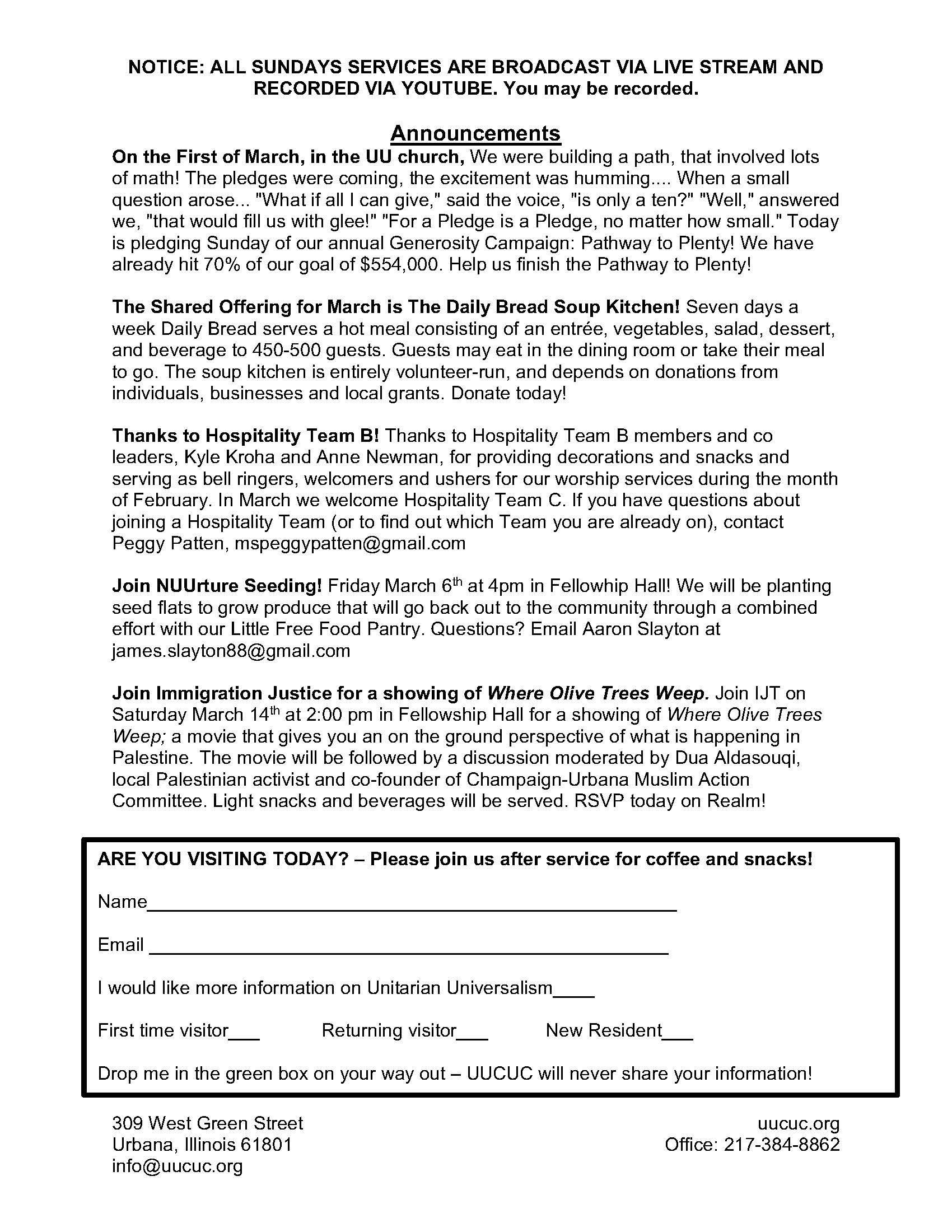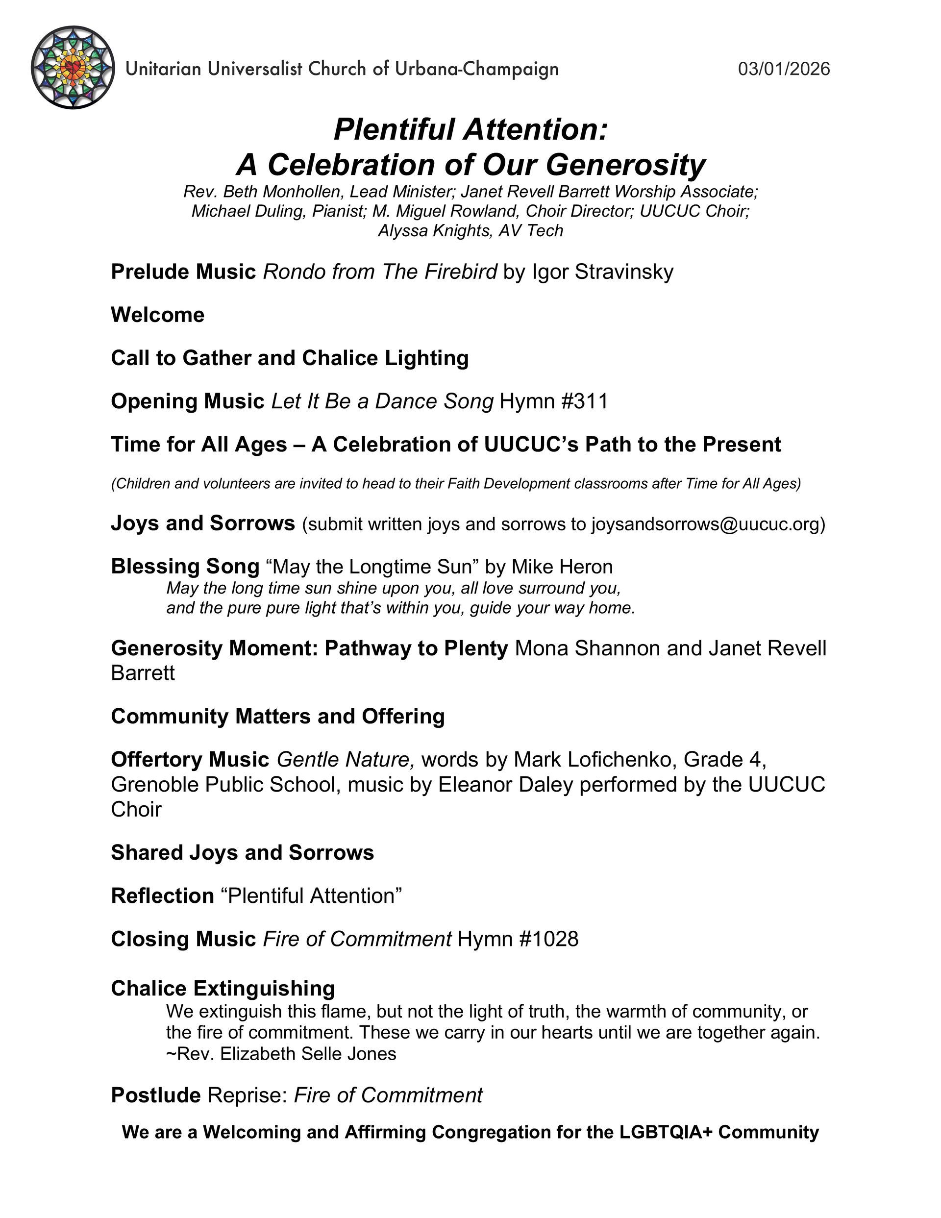 “What we pay attention to grows.” At UUCUC, we’ve been attending to practice of hope, resistance, resilience and generosity. As March begins, we celebrate our pledge drive, Pathway to Plenty, and turn our focus in worship to how we pay attention to our values and action in order to more fully live our mission. Join us today for a celebration of our history and our future. Faith Development classes will meet and the nursery will be open.