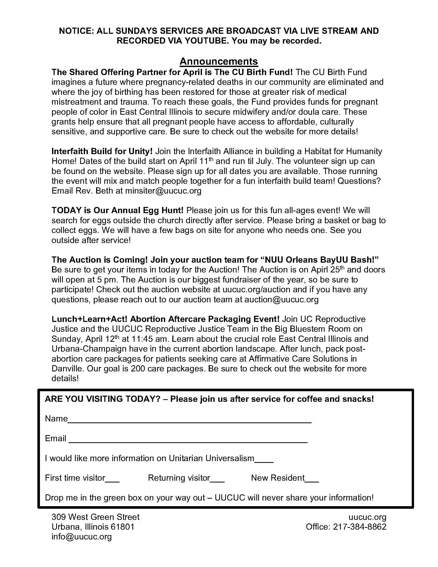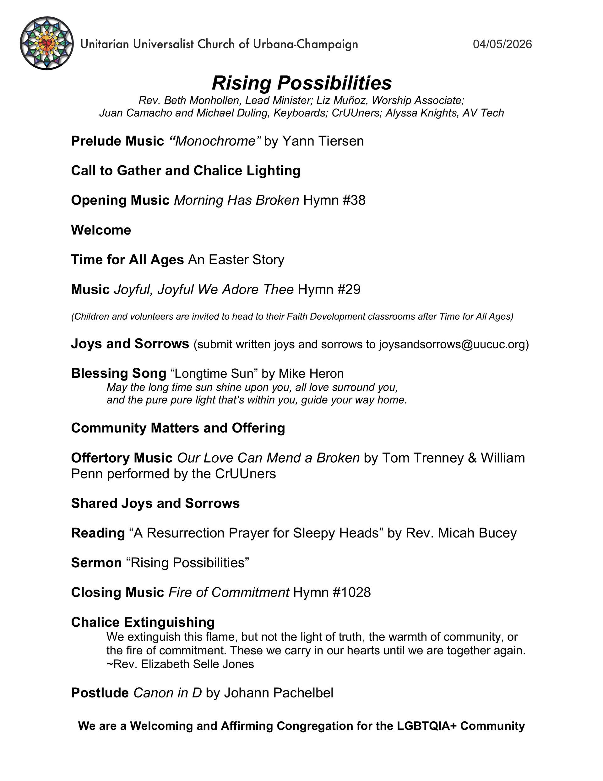 Rev. Beth leads us on this Easter Sunday in a service that explores the possibilities that arise out of the ashes of burning empires. We will take time to lament the death and destruction being wrought across the world, and to celebrate the joys arising from collective action in our own communities. Liz Munoz serves as the worship associate and the CrUUners will sing. Faith Development classes will meet and the nursery will be open. Our annual Easter Egg Hunt will be immediately after the service.